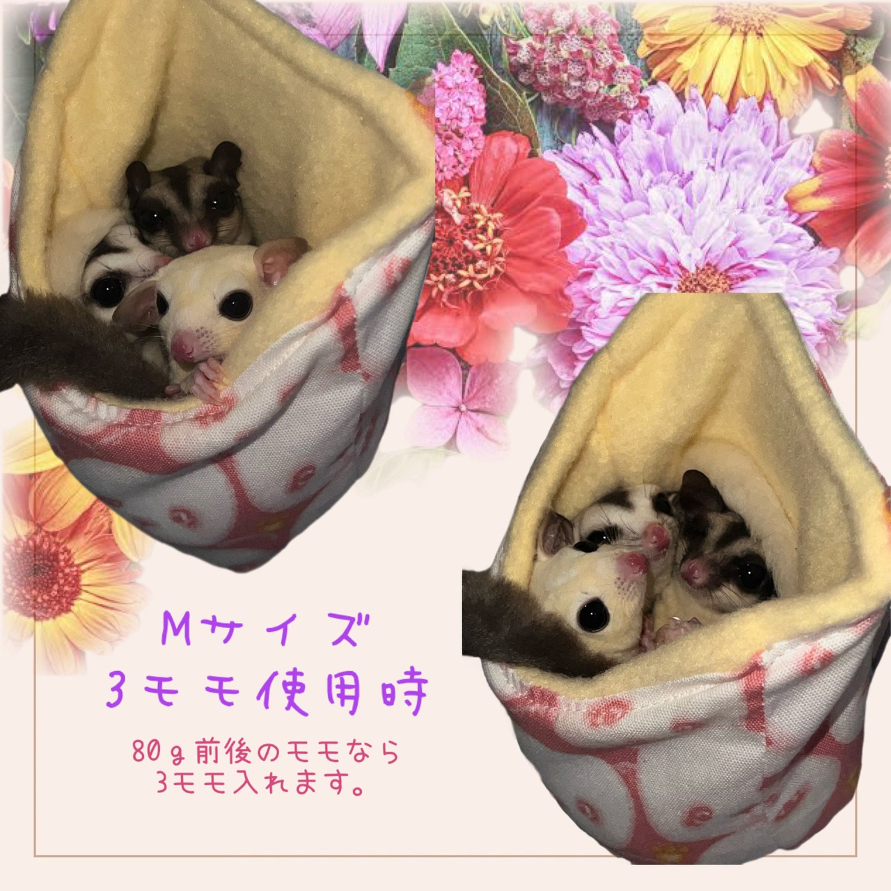 フクモモちゃんと触れ合いたい、そんな思いを込めてこの形のフクロモモンガポーチを作りました。